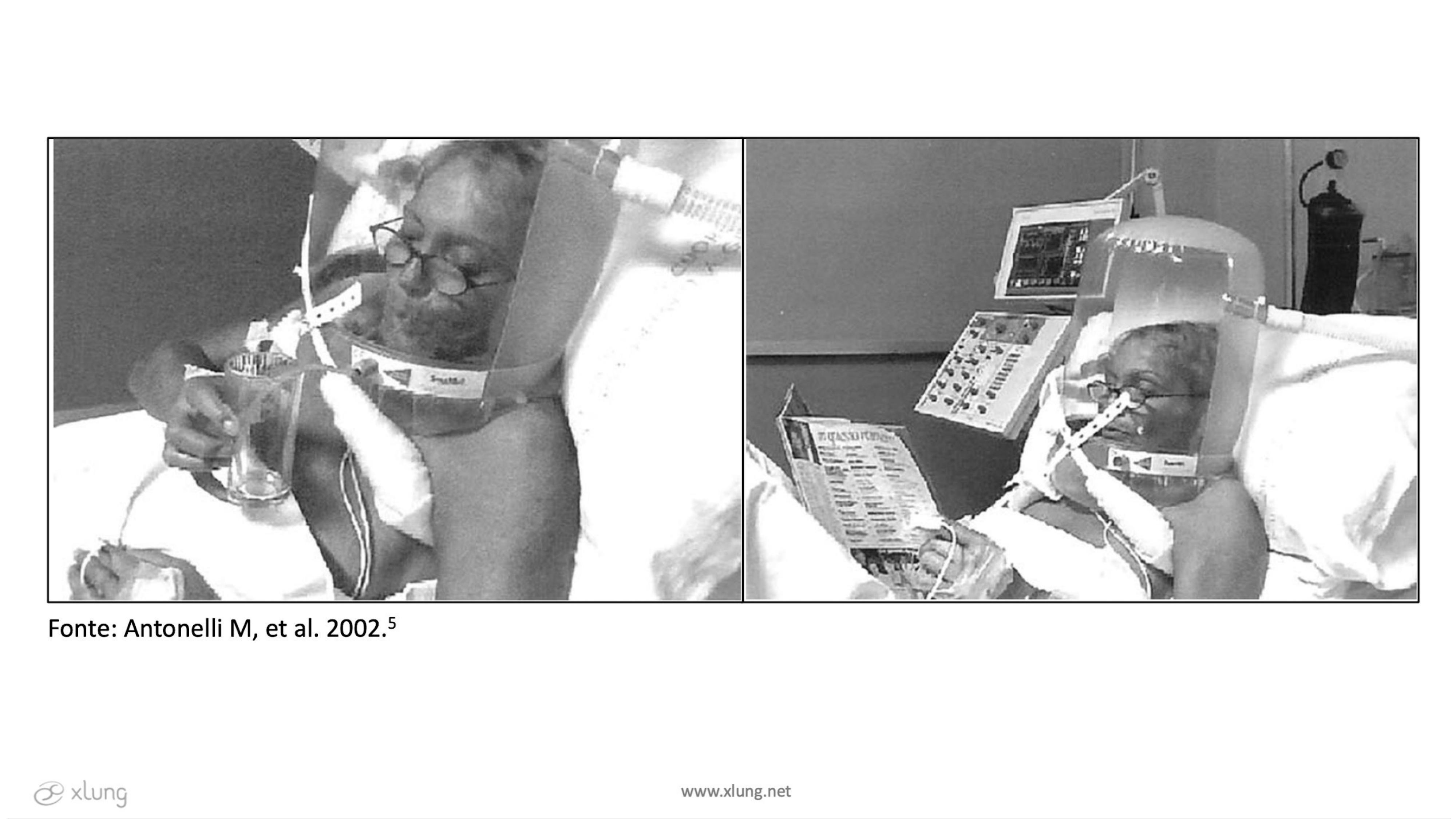 O primeiro estudo a avaliar o uso do Helmet em ofertar CPAP sem um ventilador mecânico,3 demonstrou sua eficácia no atendimento extra hospitalar em pacientes com edema agudo de pulmão (EAP).4 Em 2002, a equipe do Dr. Massimo Antonelli investigou a eficácia do sistema Helmet VNI, com dois níveis de pressão com conexão a um ventilador mecânico de UTI, para tratar pacientes adultos com Insuficiência Respiratória Aguda (IRpA) hipoxêmica em comparação com a VNI por máscara facial padrão. Houve melhor tolerância e menor número de complicações com o uso do capacete (Figura 1).5