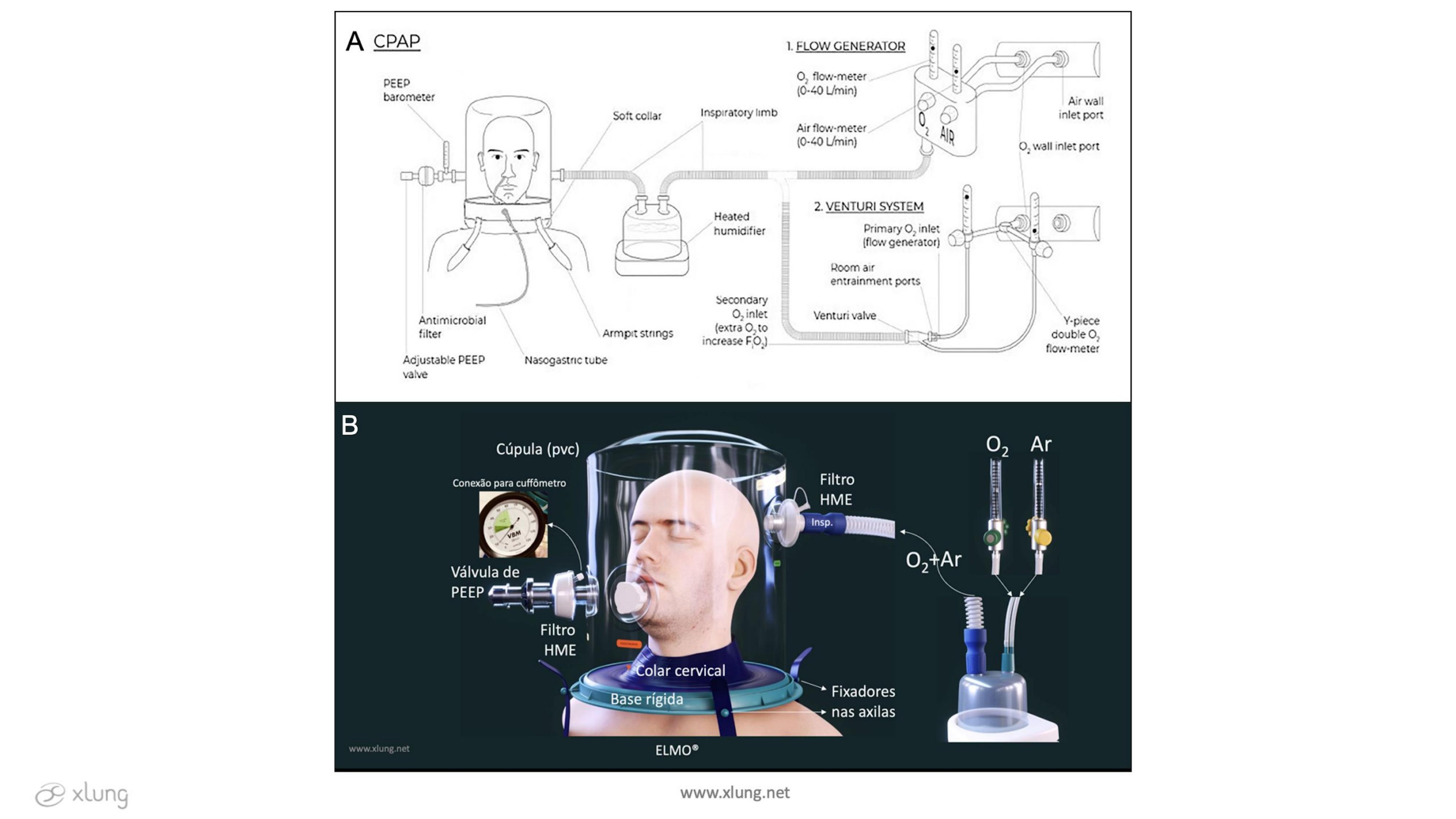 Um estudo randomizado cruzado mostrou que, o Helmet CPAP e o Helmet VNI em comparação com CNAF, possibilitou maior diminuição do esforço inspiratório e atenuou o fenômeno de pendelluft, ou seja, a transferência de volumes de gás de alvéolos com altas pressões para alvéolos com baixas pressões, o que potencialmente pode agravar o estresse sobre o parênquima pulmonar na SDRA. Os dois tipos de aplicação de Helmet melhoraram de forma semelhante a oxigenação sanguínea, por possibilitar o aumento do recrutamento das regiões dorsais do pulmão, aumentaram o volume corrente, mas reduziram o strain dinâmico pulmonar (distorção mecânica produzida pelo volume corrente no pulmão aerado). Os autores sugerem que o Helmet VNI pode ser útil em pacientes que apresentam esforço inspiratório mais intenso, enquanto o Helmet CPAP pode ser preferível se o esforço inspiratório for menor.12 Entendemos que ainda faltam estudos randomizados e controlados comparando as duas formas de abordagem na SDRA.