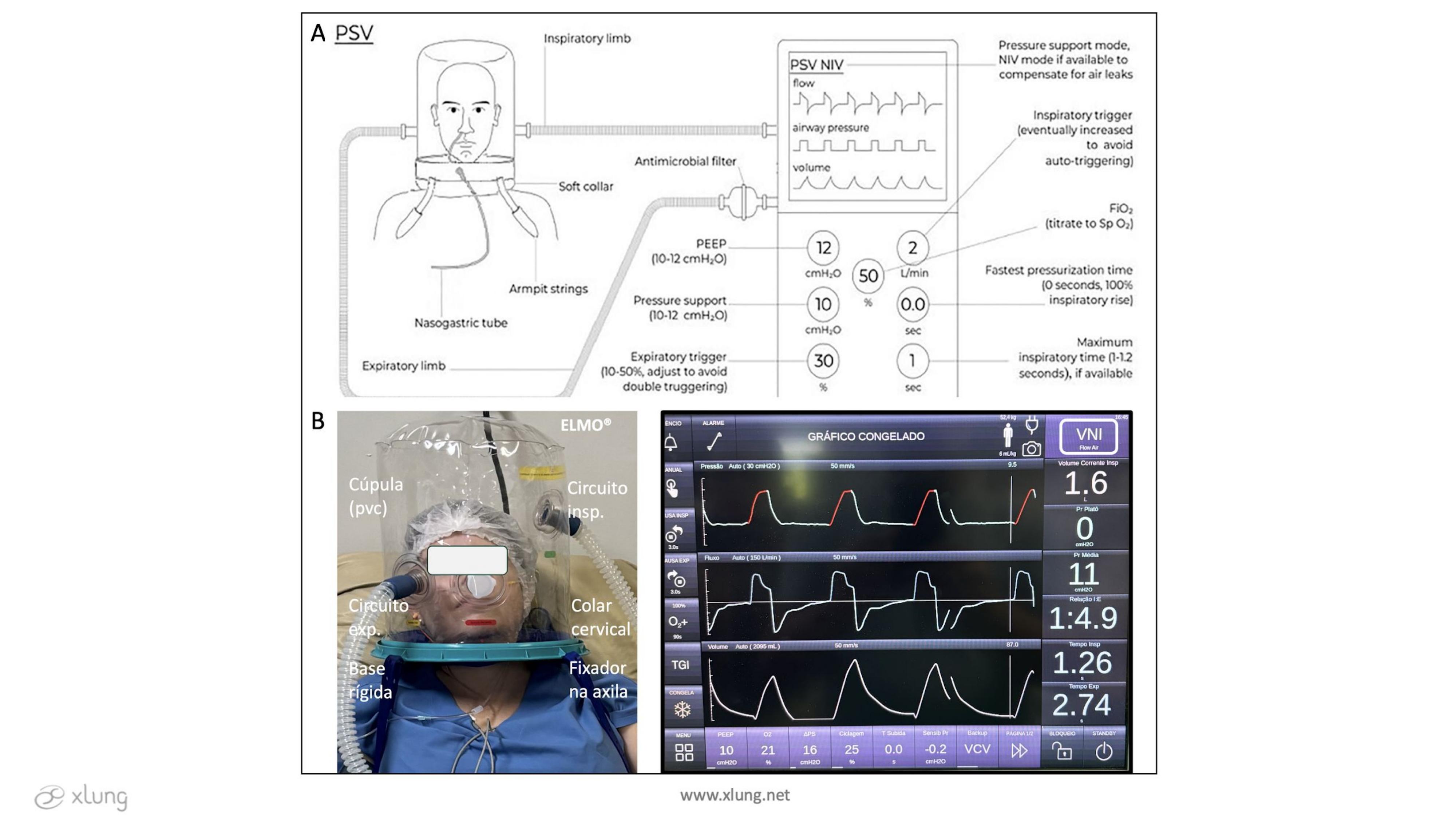 mecânico e principais ajustes. B – Voluntária saudável em uso de Capacete ELMO® conectado ao ventilador mecânico