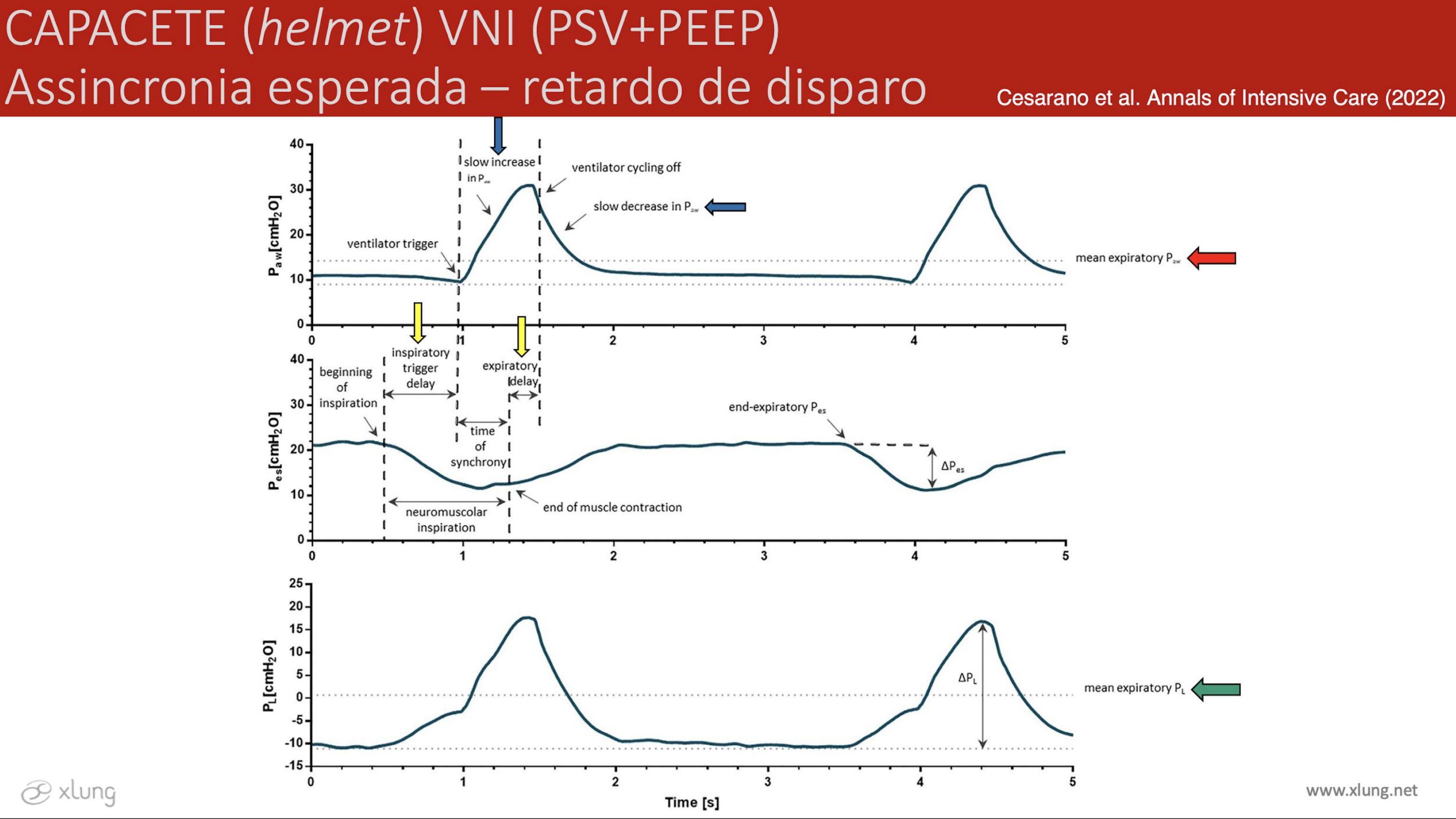 Devido aos atrasos significativos no disparo e na ciclagem causados pela conformidade da interface do capacete, há uma dessincronia entre o esforço inspiratório do paciente e a assistência fornecida pelo ventilador. No entanto, esse fenômeno, a princípio negativo, pode evitar aumentos excessivos na pressão transpulmonar durante a inspiração, fato benéfico para a proteção pulmonar em pacientes com lesão pulmonar aguda e SDRA.