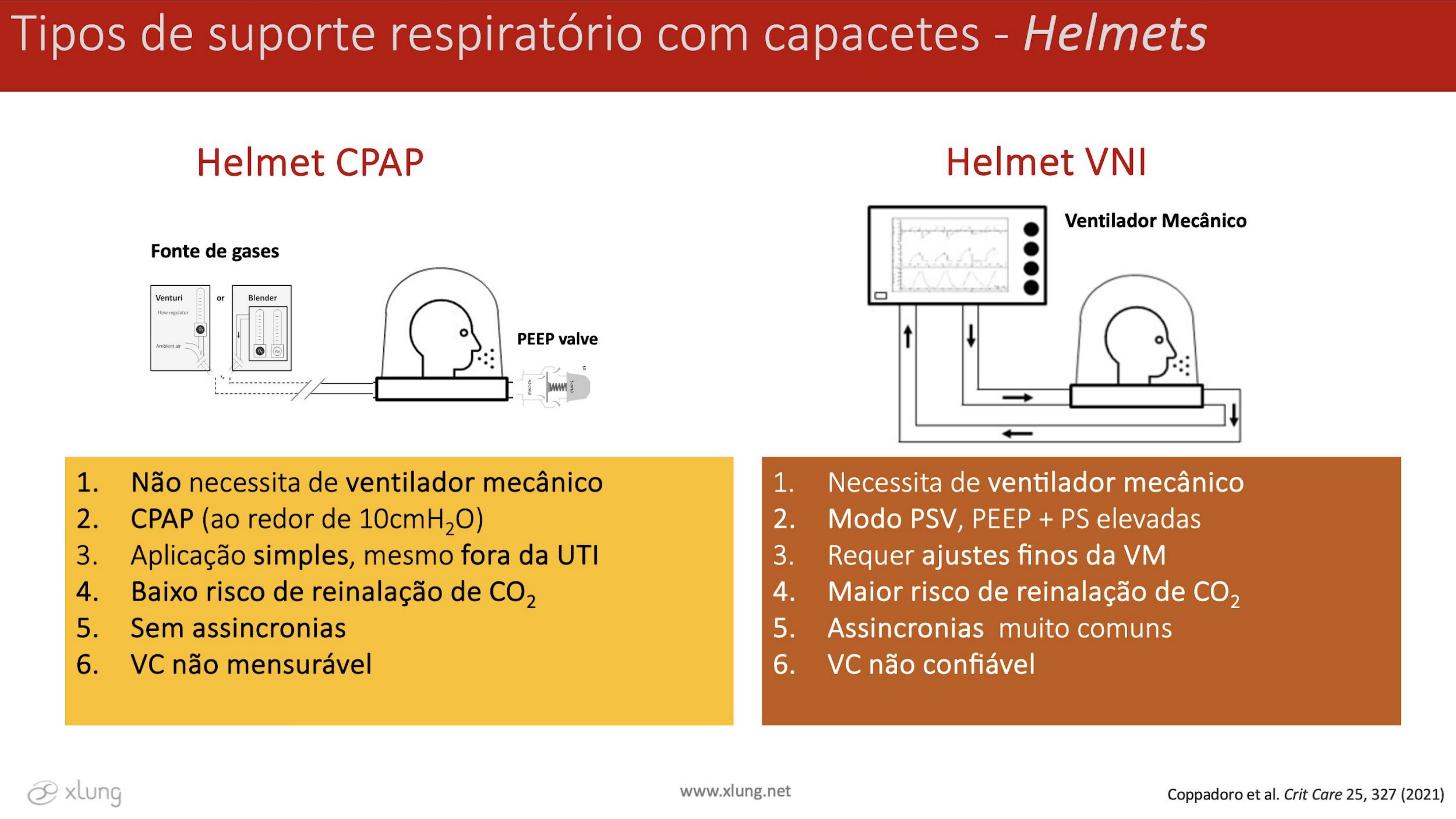 Figura 6. Descrição das principais diferenças dos tipos de suporte respiratório com capacetes: Helmet CPAP vs. Helmet VNI.