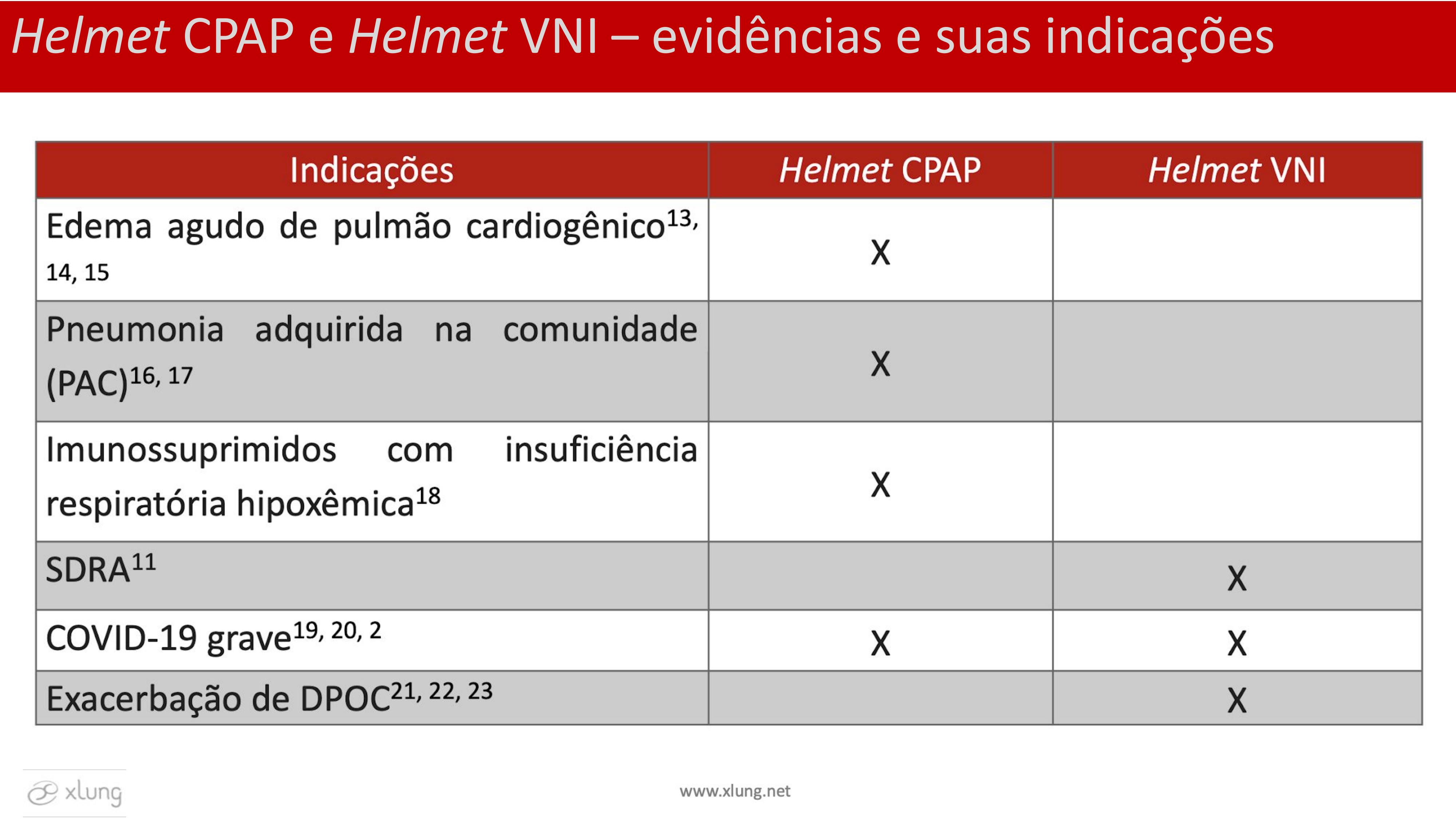 O quadro abaixo relaciona as principais indicações de uso tanto do Helmet CPAP quanto do Helmet VNI com base nos principais estudos da literatura.