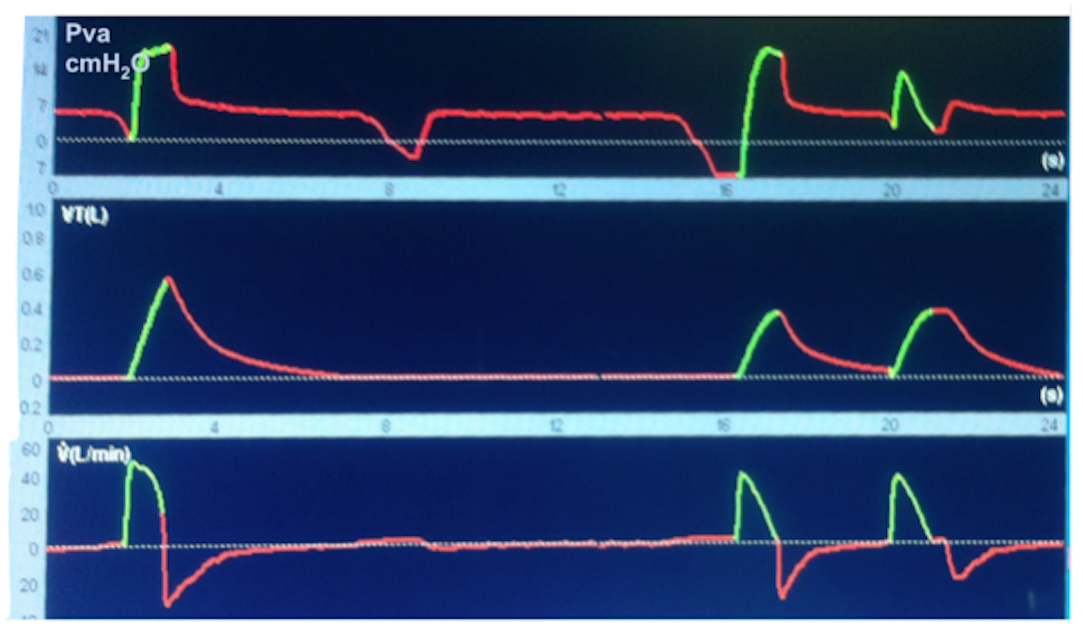 Os seguintes achados chamaram a atenção na tela do ventilador mecânico.